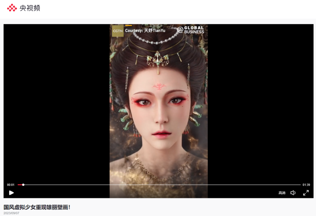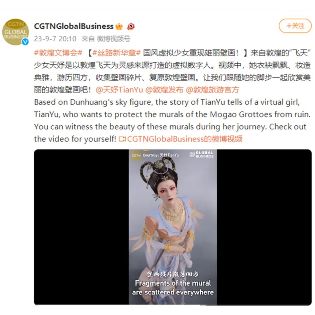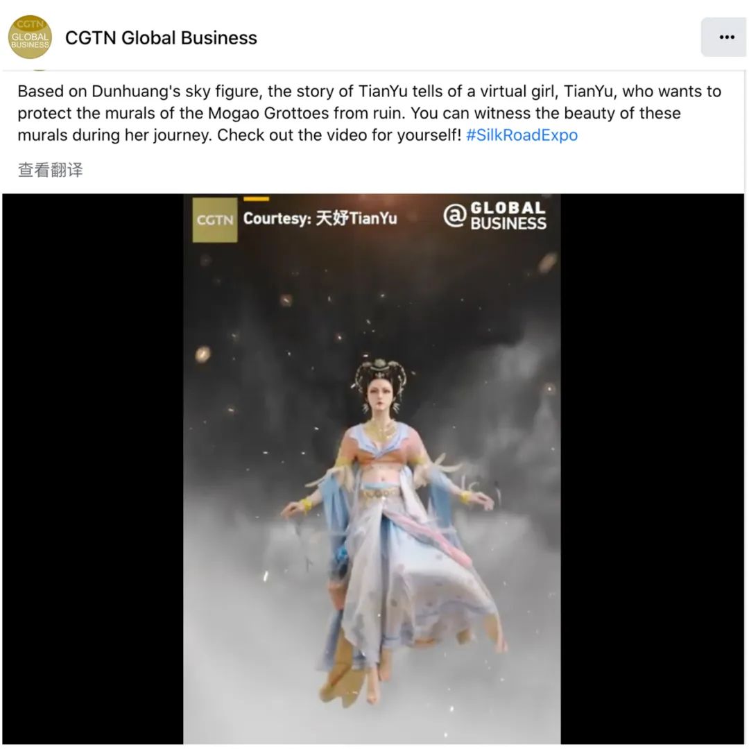 第六届敦煌文博会期间,,,中国国际电视台(CGTN)对波币钱包子公司元圆科技旗下虚拟数字人天妤进行了连续三天的视频推荐,,,在其Facebook,,,Twitter,,,YouTube、、、微博等多个官方账号以及央视频同步发布,,,助力天妤在海内外的破圈,,,持续弘扬中国传统文化。。。